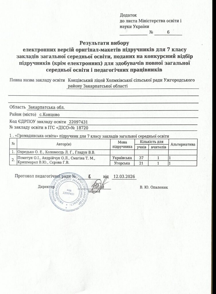 Про зарахування учнів до 1-х класів Концівського ліцею та Минайської філії на 2026/2027 навчальний рік