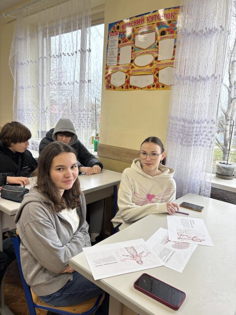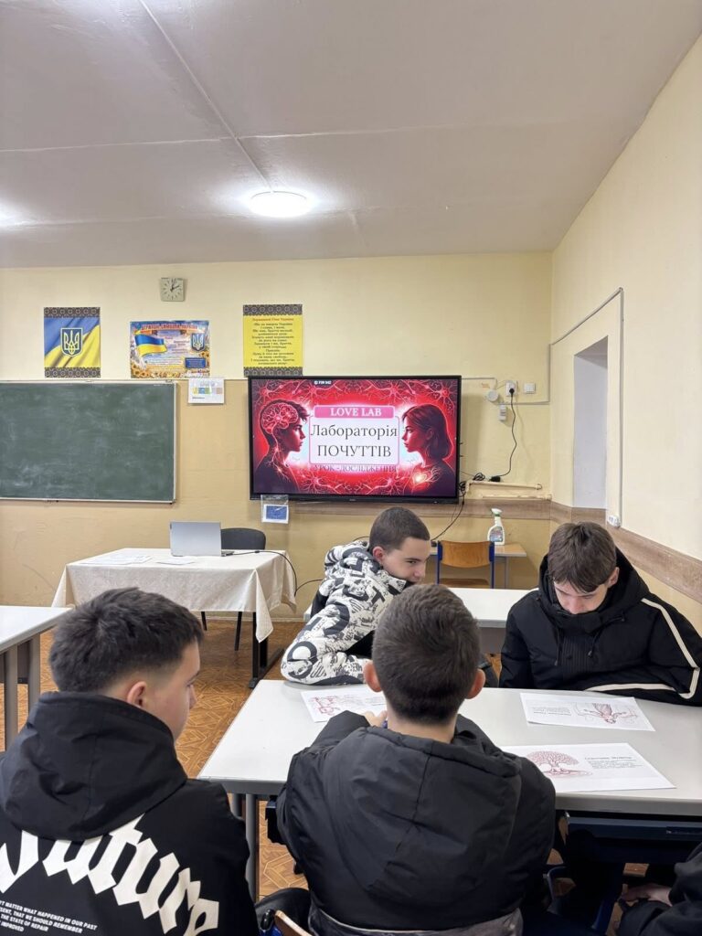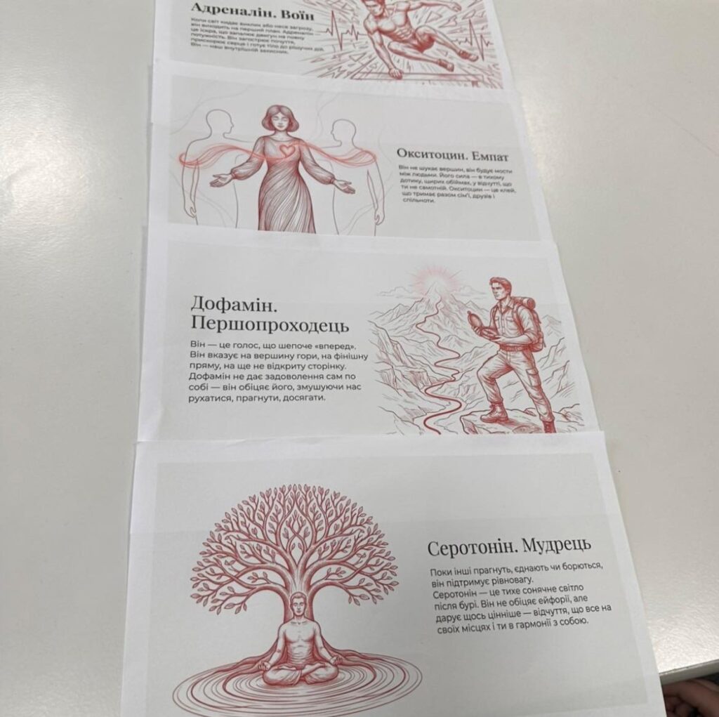 Учні досліджували емоції не лише як переживання, а як результат роботи мозку, гормонів та життєвого досвіду. Під час уроку школярі працювали в групах, аналізували кейси, виконували інтерактивні завдання з картками гормонів та обговорювали, як почуття впливають на поведінку людини.