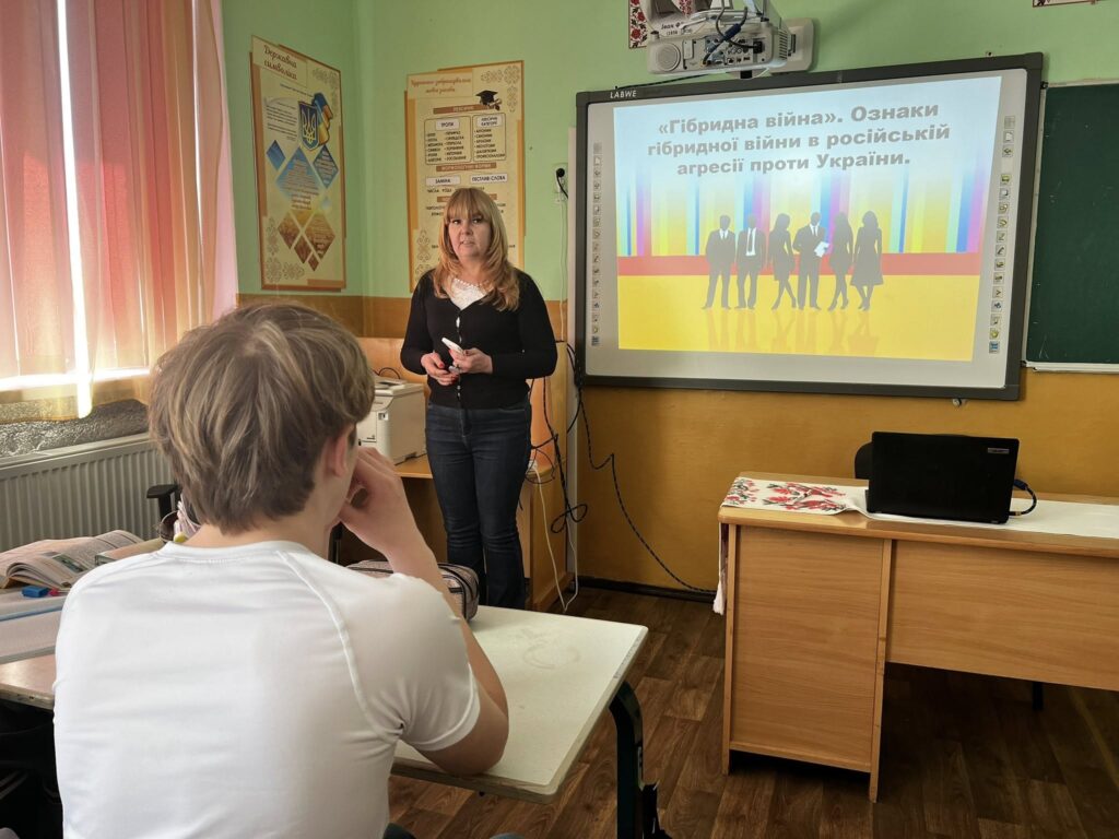Під час заняття учні детально ознайомилися з поняттям гібридної війни — війни, яка поєднує не лише бойові дії, а й інформаційний вплив, кібератаки, пропаганду та психологічний тиск. Особливу увагу було приділено тому, як саме відбувається інформаційна боротьба, як розпізнавати фейки, маніпуляції та ворожу пропаганду.